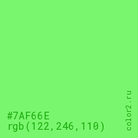 Цвет #7AF66E в цветовой модели RGB обозначается тремя октетами (122, 246, 110) в десятичном формате и #7AF66E в шестнадцатиричном (hex) формате, которые являются интенсивностью красного 122 (hex 7A), интенсивность зелёного 246 (hex F6) и интенсивность синего 110 (hex 6E).