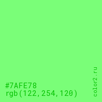 Цвет #7AFE78 в цветовой модели RGB обозначается тремя октетами (122, 254, 120) в десятичном формате и #7AFE78 в шестнадцатиричном (hex) формате, которые являются интенсивностью красного 122 (hex 7A), интенсивность зелёного 254 (hex FE) и интенсивность синего 120 (hex 78).