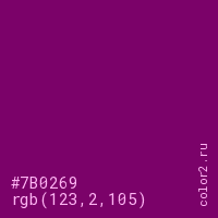 Цвет #7B0269 в цветовой модели RGB обозначается тремя октетами (123, 2, 105) в десятичном формате и #7B0269 в шестнадцатиричном (hex) формате, которые являются интенсивностью красного 123 (hex 7B), интенсивность зелёного 2 (hex 02) и интенсивность синего 105 (hex 69).