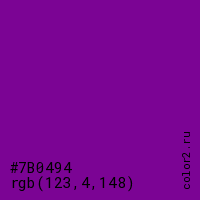 Цвет #7B0494 в цветовой модели RGB обозначается тремя октетами (123, 4, 148) в десятичном формате и #7B0494 в шестнадцатиричном (hex) формате, которые являются интенсивностью красного 123 (hex 7B), интенсивность зелёного 4 (hex 04) и интенсивность синего 148 (hex 94).