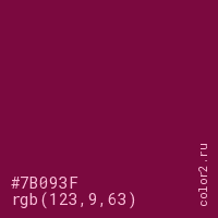 Цвет #7B093F в цветовой модели RGB обозначается тремя октетами (123, 9, 63) в десятичном формате и #7B093F в шестнадцатиричном (hex) формате, которые являются интенсивностью красного 123 (hex 7B), интенсивность зелёного 9 (hex 09) и интенсивность синего 63 (hex 3F).