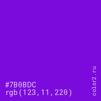 Цвет #7B0BDC в цветовой модели RGB обозначается тремя октетами (123, 11, 220) в десятичном формате и #7B0BDC в шестнадцатиричном (hex) формате, которые являются интенсивностью красного 123 (hex 7B), интенсивность зелёного 11 (hex 0B) и интенсивность синего 220 (hex DC).