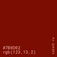 Цвет #7B0D02 в цветовой модели RGB обозначается тремя октетами (123, 13, 2) в десятичном формате и #7B0D02 в шестнадцатиричном (hex) формате, которые являются интенсивностью красного 123 (hex 7B), интенсивность зелёного 13 (hex 0D) и интенсивность синего 2 (hex 02).