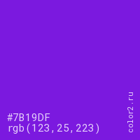 Цвет #7B19DF в цветовой модели RGB обозначается тремя октетами (123, 25, 223) в десятичном формате и #7B19DF в шестнадцатиричном (hex) формате, которые являются интенсивностью красного 123 (hex 7B), интенсивность зелёного 25 (hex 19) и интенсивность синего 223 (hex DF).