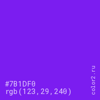 Цвет #7B1DF0 в цветовой модели RGB обозначается тремя октетами (123, 29, 240) в десятичном формате и #7B1DF0 в шестнадцатиричном (hex) формате, которые являются интенсивностью красного 123 (hex 7B), интенсивность зелёного 29 (hex 1D) и интенсивность синего 240 (hex F0).