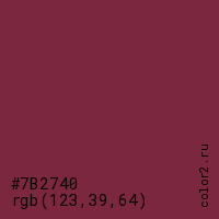 Цвет #7B2740 в цветовой модели RGB обозначается тремя октетами (123, 39, 64) в десятичном формате и #7B2740 в шестнадцатиричном (hex) формате, которые являются интенсивностью красного 123 (hex 7B), интенсивность зелёного 39 (hex 27) и интенсивность синего 64 (hex 40).