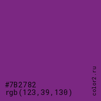 Цвет #7B2782 в цветовой модели RGB обозначается тремя октетами (123, 39, 130) в десятичном формате и #7B2782 в шестнадцатиричном (hex) формате, которые являются интенсивностью красного 123 (hex 7B), интенсивность зелёного 39 (hex 27) и интенсивность синего 130 (hex 82).