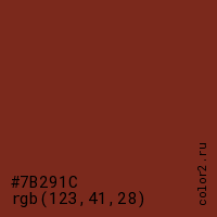 Цвет #7B291C в цветовой модели RGB обозначается тремя октетами (123, 41, 28) в десятичном формате и #7B291C в шестнадцатиричном (hex) формате, которые являются интенсивностью красного 123 (hex 7B), интенсивность зелёного 41 (hex 29) и интенсивность синего 28 (hex 1C).