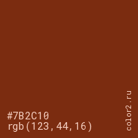 Цвет #7B2C10 в цветовой модели RGB обозначается тремя октетами (123, 44, 16) в десятичном формате и #7B2C10 в шестнадцатиричном (hex) формате, которые являются интенсивностью красного 123 (hex 7B), интенсивность зелёного 44 (hex 2C) и интенсивность синего 16 (hex 10).