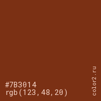Цвет #7B3014 в цветовой модели RGB обозначается тремя октетами (123, 48, 20) в десятичном формате и #7B3014 в шестнадцатиричном (hex) формате, которые являются интенсивностью красного 123 (hex 7B), интенсивность зелёного 48 (hex 30) и интенсивность синего 20 (hex 14).