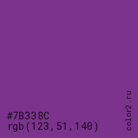 Цвет #7B338C в цветовой модели RGB обозначается тремя октетами (123, 51, 140) в десятичном формате и #7B338C в шестнадцатиричном (hex) формате, которые являются интенсивностью красного 123 (hex 7B), интенсивность зелёного 51 (hex 33) и интенсивность синего 140 (hex 8C).