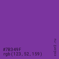 Цвет #7B349F в цветовой модели RGB обозначается тремя октетами (123, 52, 159) в десятичном формате и #7B349F в шестнадцатиричном (hex) формате, которые являются интенсивностью красного 123 (hex 7B), интенсивность зелёного 52 (hex 34) и интенсивность синего 159 (hex 9F).