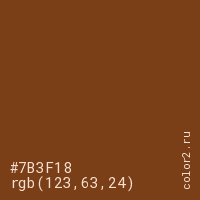 Цвет #7B3F18 в цветовой модели RGB обозначается тремя октетами (123, 63, 24) в десятичном формате и #7B3F18 в шестнадцатиричном (hex) формате, которые являются интенсивностью красного 123 (hex 7B), интенсивность зелёного 63 (hex 3F) и интенсивность синего 24 (hex 18).
