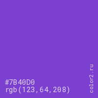 Цвет #7B40D0 в цветовой модели RGB обозначается тремя октетами (123, 64, 208) в десятичном формате и #7B40D0 в шестнадцатиричном (hex) формате, которые являются интенсивностью красного 123 (hex 7B), интенсивность зелёного 64 (hex 40) и интенсивность синего 208 (hex D0).