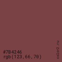 Цвет #7B4246 в цветовой модели RGB обозначается тремя октетами (123, 66, 70) в десятичном формате и #7B4246 в шестнадцатиричном (hex) формате, которые являются интенсивностью красного 123 (hex 7B), интенсивность зелёного 66 (hex 42) и интенсивность синего 70 (hex 46).