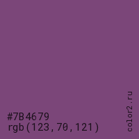 Цвет #7B4679 в цветовой модели RGB обозначается тремя октетами (123, 70, 121) в десятичном формате и #7B4679 в шестнадцатиричном (hex) формате, которые являются интенсивностью красного 123 (hex 7B), интенсивность зелёного 70 (hex 46) и интенсивность синего 121 (hex 79).