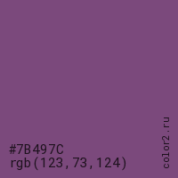 Цвет #7B497C в цветовой модели RGB обозначается тремя октетами (123, 73, 124) в десятичном формате и #7B497C в шестнадцатиричном (hex) формате, которые являются интенсивностью красного 123 (hex 7B), интенсивность зелёного 73 (hex 49) и интенсивность синего 124 (hex 7C).