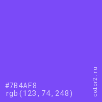 Цвет #7B4AF8 в цветовой модели RGB обозначается тремя октетами (123, 74, 248) в десятичном формате и #7B4AF8 в шестнадцатиричном (hex) формате, которые являются интенсивностью красного 123 (hex 7B), интенсивность зелёного 74 (hex 4A) и интенсивность синего 248 (hex F8).