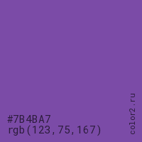 Цвет #7B4BA7 в цветовой модели RGB обозначается тремя октетами (123, 75, 167) в десятичном формате и #7B4BA7 в шестнадцатиричном (hex) формате, которые являются интенсивностью красного 123 (hex 7B), интенсивность зелёного 75 (hex 4B) и интенсивность синего 167 (hex A7).