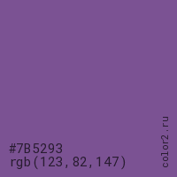 Цвет #7B5293 в цветовой модели RGB обозначается тремя октетами (123, 82, 147) в десятичном формате и #7B5293 в шестнадцатиричном (hex) формате, которые являются интенсивностью красного 123 (hex 7B), интенсивность зелёного 82 (hex 52) и интенсивность синего 147 (hex 93).