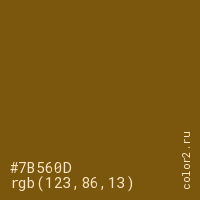 Цвет #7B560D в цветовой модели RGB обозначается тремя октетами (123, 86, 13) в десятичном формате и #7B560D в шестнадцатиричном (hex) формате, которые являются интенсивностью красного 123 (hex 7B), интенсивность зелёного 86 (hex 56) и интенсивность синего 13 (hex 0D).