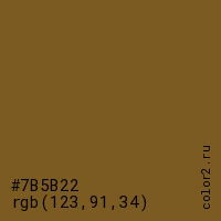 Цвет #7B5B22 в цветовой модели RGB обозначается тремя октетами (123, 91, 34) в десятичном формате и #7B5B22 в шестнадцатиричном (hex) формате, которые являются интенсивностью красного 123 (hex 7B), интенсивность зелёного 91 (hex 5B) и интенсивность синего 34 (hex 22).
