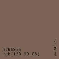Цвет #7B6356 в цветовой модели RGB обозначается тремя октетами (123, 99, 86) в десятичном формате и #7B6356 в шестнадцатиричном (hex) формате, которые являются интенсивностью красного 123 (hex 7B), интенсивность зелёного 99 (hex 63) и интенсивность синего 86 (hex 56).