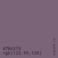 Цвет #7B6378 в цветовой модели RGB обозначается тремя октетами (123, 99, 120) в десятичном формате и #7B6378 в шестнадцатиричном (hex) формате, которые являются интенсивностью красного 123 (hex 7B), интенсивность зелёного 99 (hex 63) и интенсивность синего 120 (hex 78).
