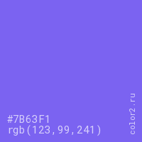 Цвет #7B63F1 в цветовой модели RGB обозначается тремя октетами (123, 99, 241) в десятичном формате и #7B63F1 в шестнадцатиричном (hex) формате, которые являются интенсивностью красного 123 (hex 7B), интенсивность зелёного 99 (hex 63) и интенсивность синего 241 (hex F1).
