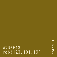 Цвет #7B6513 в цветовой модели RGB обозначается тремя октетами (123, 101, 19) в десятичном формате и #7B6513 в шестнадцатиричном (hex) формате, которые являются интенсивностью красного 123 (hex 7B), интенсивность зелёного 101 (hex 65) и интенсивность синего 19 (hex 13).