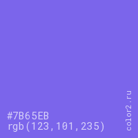 Цвет #7B65EB в цветовой модели RGB обозначается тремя октетами (123, 101, 235) в десятичном формате и #7B65EB в шестнадцатиричном (hex) формате, которые являются интенсивностью красного 123 (hex 7B), интенсивность зелёного 101 (hex 65) и интенсивность синего 235 (hex EB).