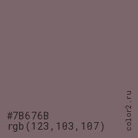 Цвет #7B676B в цветовой модели RGB обозначается тремя октетами (123, 103, 107) в десятичном формате и #7B676B в шестнадцатиричном (hex) формате, которые являются интенсивностью красного 123 (hex 7B), интенсивность зелёного 103 (hex 67) и интенсивность синего 107 (hex 6B).