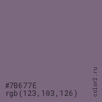 Цвет #7B677E в цветовой модели RGB обозначается тремя октетами (123, 103, 126) в десятичном формате и #7B677E в шестнадцатиричном (hex) формате, которые являются интенсивностью красного 123 (hex 7B), интенсивность зелёного 103 (hex 67) и интенсивность синего 126 (hex 7E).