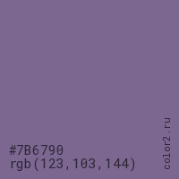 Цвет #7B6790 в цветовой модели RGB обозначается тремя октетами (123, 103, 144) в десятичном формате и #7B6790 в шестнадцатиричном (hex) формате, которые являются интенсивностью красного 123 (hex 7B), интенсивность зелёного 103 (hex 67) и интенсивность синего 144 (hex 90).