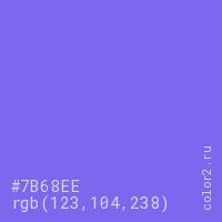 Цвет #7B68EE в цветовой модели RGB обозначается тремя октетами (123, 104, 238) в десятичном формате и #7B68EE в шестнадцатиричном (hex) формате, которые являются интенсивностью красного 123 (hex 7B), интенсивность зелёного 104 (hex 68) и интенсивность синего 238 (hex EE).