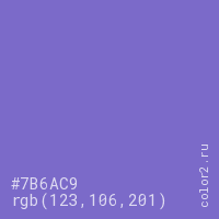 Цвет #7B6AC9 в цветовой модели RGB обозначается тремя октетами (123, 106, 201) в десятичном формате и #7B6AC9 в шестнадцатиричном (hex) формате, которые являются интенсивностью красного 123 (hex 7B), интенсивность зелёного 106 (hex 6A) и интенсивность синего 201 (hex C9).