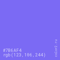 Цвет #7B6AF4 в цветовой модели RGB обозначается тремя октетами (123, 106, 244) в десятичном формате и #7B6AF4 в шестнадцатиричном (hex) формате, которые являются интенсивностью красного 123 (hex 7B), интенсивность зелёного 106 (hex 6A) и интенсивность синего 244 (hex F4).