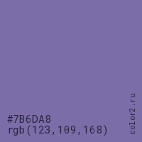 Цвет #7B6DA8 в цветовой модели RGB обозначается тремя октетами (123, 109, 168) в десятичном формате и #7B6DA8 в шестнадцатиричном (hex) формате, которые являются интенсивностью красного 123 (hex 7B), интенсивность зелёного 109 (hex 6D) и интенсивность синего 168 (hex A8).