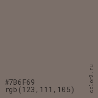 Цвет #7B6F69 в цветовой модели RGB обозначается тремя октетами (123, 111, 105) в десятичном формате и #7B6F69 в шестнадцатиричном (hex) формате, которые являются интенсивностью красного 123 (hex 7B), интенсивность зелёного 111 (hex 6F) и интенсивность синего 105 (hex 69).