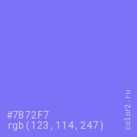 Цвет #7B72F7 в цветовой модели RGB обозначается тремя октетами (123, 114, 247) в десятичном формате и #7B72F7 в шестнадцатиричном (hex) формате, которые являются интенсивностью красного 123 (hex 7B), интенсивность зелёного 114 (hex 72) и интенсивность синего 247 (hex F7).