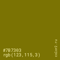 Цвет #7B7303 в цветовой модели RGB обозначается тремя октетами (123, 115, 3) в десятичном формате и #7B7303 в шестнадцатиричном (hex) формате, которые являются интенсивностью красного 123 (hex 7B), интенсивность зелёного 115 (hex 73) и интенсивность синего 3 (hex 03).