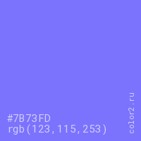 Цвет #7B73FD в цветовой модели RGB обозначается тремя октетами (123, 115, 253) в десятичном формате и #7B73FD в шестнадцатиричном (hex) формате, которые являются интенсивностью красного 123 (hex 7B), интенсивность зелёного 115 (hex 73) и интенсивность синего 253 (hex FD).
