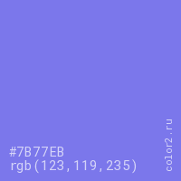 Цвет #7B77EB в цветовой модели RGB обозначается тремя октетами (123, 119, 235) в десятичном формате и #7B77EB в шестнадцатиричном (hex) формате, которые являются интенсивностью красного 123 (hex 7B), интенсивность зелёного 119 (hex 77) и интенсивность синего 235 (hex EB).
