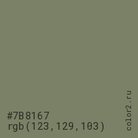 Цвет #7B8167 в цветовой модели RGB обозначается тремя октетами (123, 129, 103) в десятичном формате и #7B8167 в шестнадцатиричном (hex) формате, которые являются интенсивностью красного 123 (hex 7B), интенсивность зелёного 129 (hex 81) и интенсивность синего 103 (hex 67).