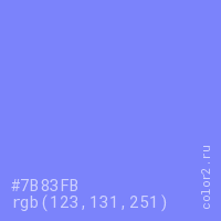 Цвет #7B83FB в цветовой модели RGB обозначается тремя октетами (123, 131, 251) в десятичном формате и #7B83FB в шестнадцатиричном (hex) формате, которые являются интенсивностью красного 123 (hex 7B), интенсивность зелёного 131 (hex 83) и интенсивность синего 251 (hex FB).