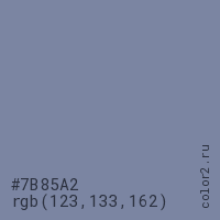 Цвет #7B85A2 в цветовой модели RGB обозначается тремя октетами (123, 133, 162) в десятичном формате и #7B85A2 в шестнадцатиричном (hex) формате, которые являются интенсивностью красного 123 (hex 7B), интенсивность зелёного 133 (hex 85) и интенсивность синего 162 (hex A2).