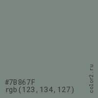 Цвет #7B867F в цветовой модели RGB обозначается тремя октетами (123, 134, 127) в десятичном формате и #7B867F в шестнадцатиричном (hex) формате, которые являются интенсивностью красного 123 (hex 7B), интенсивность зелёного 134 (hex 86) и интенсивность синего 127 (hex 7F).
