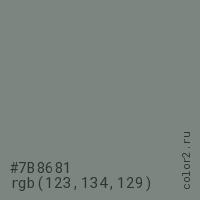 Цвет #7B8681 в цветовой модели RGB обозначается тремя октетами (123, 134, 129) в десятичном формате и #7B8681 в шестнадцатиричном (hex) формате, которые являются интенсивностью красного 123 (hex 7B), интенсивность зелёного 134 (hex 86) и интенсивность синего 129 (hex 81).