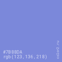 Цвет #7B88DA в цветовой модели RGB обозначается тремя октетами (123, 136, 218) в десятичном формате и #7B88DA в шестнадцатиричном (hex) формате, которые являются интенсивностью красного 123 (hex 7B), интенсивность зелёного 136 (hex 88) и интенсивность синего 218 (hex DA).