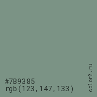 Цвет #7B9385 в цветовой модели RGB обозначается тремя октетами (123, 147, 133) в десятичном формате и #7B9385 в шестнадцатиричном (hex) формате, которые являются интенсивностью красного 123 (hex 7B), интенсивность зелёного 147 (hex 93) и интенсивность синего 133 (hex 85).